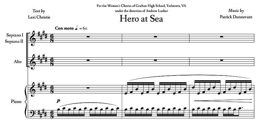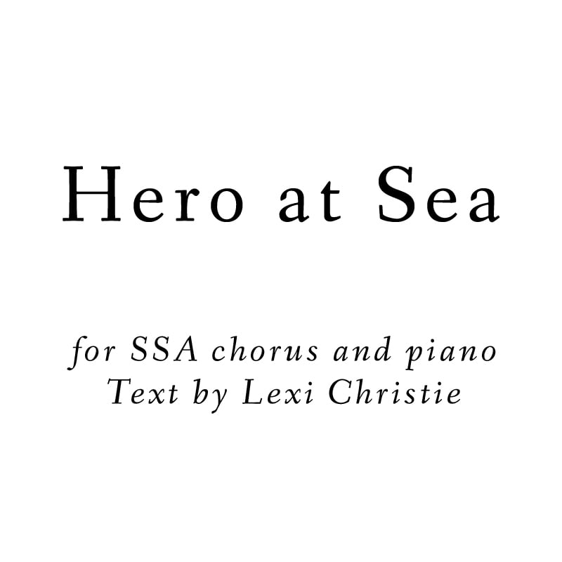 A choral work for SSA chorus and piano. This work was commissioned by the Grafton High School Women's Chorus in Yorktown, VA, under the direction of Andrew Lusher. The text, "Hero at Sea", is a poem by Grafton High sophomore Lexi Christie, and tells the story of a daring captain of a ship who weathers a fierce storm while on the ocean.